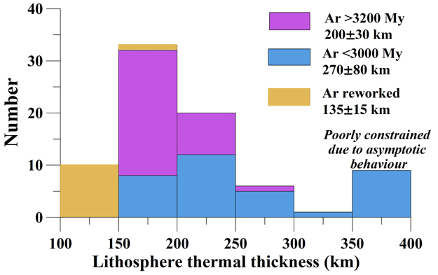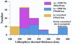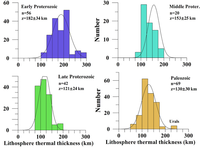| Figure 3. Statistics of lithosphere thermal thickness based on heat flow data estimates (point data); (upper) Proterozoic-Paleozoic terranes; (lower) Archean terranes. |