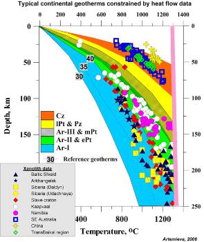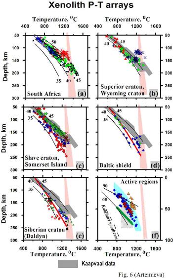 | Figure 6. Xenolith geotherms for continents clearly indicate two typical cratonic geotherms: ~45 mWm2 (a, b) and ~37 mWm2 (c-e). Because xenolith P-T arrays constrained by different geothermobarometers are significantly different, the data are shown mostly for the BKN method (Brey, Taylor, 2000), MC (MacGregor, 1974), FB (Finnerty and Boyd, 1987) and ONW (O’Neill and Wood, 1979). Thin lines – conductive geotherms of Pollack and Chapman (1977), values are surface heat flow in mW/m2. Pink shading – mantle adiabat. (a) South Africa: blue triangles – Kimberly (Kaapvaal), green rhombs – Lesotho, red crosses – Gideon, Namibia (all three BKN-NT data from Grutter and Moore, 2003); black circles – xenolith data from several locations in Kaapvaal (compilation of Rudnick and Ny¬blade, 1999); these data are shown in plots (b-e) by gray shading; (b) Superior craton (Kirkland Lake) - green rhombs (data from Pearson et al., 1998); Wyo¬ming craton - blue pluses (NT-NT data from Pizzolato and Schultze, 2003) and blue crosses (BKN data from Hearn, 2003); red triangles –SW Arkansas (BKN data from Dunn et al., 2003); (c) Slave craton: red rhombs – low-T peridotites (red lineshows the best-fit) (BKN data from Kopylova et al., 1999; Kopylova and McCammon, 2003), red crosses – high-T peridotites (BKN data from Kopylova and McCammon, 2003); blue triangles – Lac de Gras area (BKN data from Menzies et al., 2003); green pluses – Somerset Island (MC-NT data from Grutter and Moore, 2003); (d) Fennoscandia: blue rhombs - central Finland (BKN data from Kukkonen and Peltonen, 1999; Lehtonen et al., 2003); green crosses – Arkhangelsk, pipe Grib (BK-MC data from Malkovets et al., 2003); red line – best fit for the Slave craton; (e) Siberian craton (Daldyn terrane): blue rhombs and green triangles (correspondingly, FB and ONW data from Griffin et al., 1996); black pluses – Zarnitsa pipe, red crosses – Irelyakhskaya pipe (both NT-NT data from Aschepkov et al., 2003); (f) active regions: orange triangles – SE China (data from Xu et al., 1996); blue diamonds – SE Australia (data from O’Reilly and Griffin, 1985); red crosses – Tariat region, Mongolia (data from Ionov et al., 1998); blue shading – Baikal region: Sayans, Vitim, and Udokan (data from Litasov et al., 2003); green line – Rhenish massif (after LeBas, 1987); hatched area – Massif Central (after Coisy and Nicolas, 1978; Masse, 1983); for a comparison a typical Kalahari geotherm is shown by dashed line (Rudnick and Nyblade, 1999). Note different depth scale of the plot. |